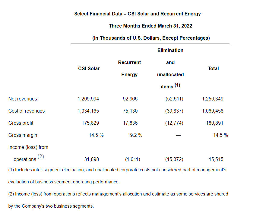 The following tables provide unaudited select financial data for the Company’s CSI Solar and Recurrent Energy businesses.