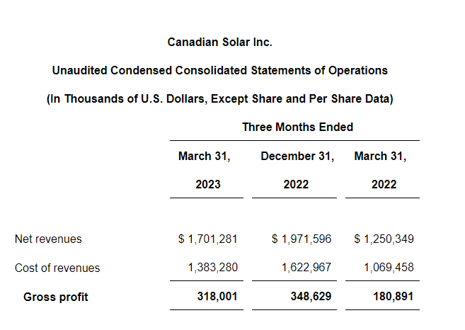 Cision View original content:https://www.prnewswire.com/news-releases/canadian-solar-reports-first-quarter-2023-results-301828321.html