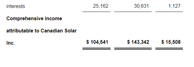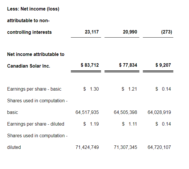 • Net income attributable to Canadian Solar of $84 million or $1.19 per diluted share.